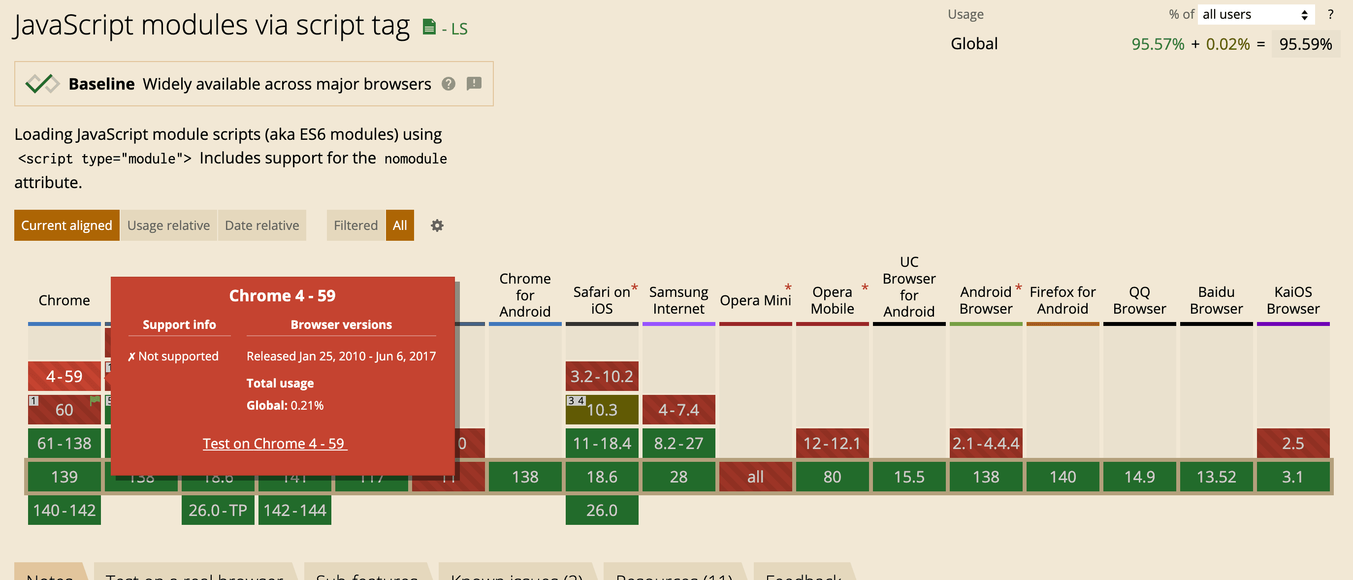 브라우저가 esm 모듈을 실행할 수 있냐는 <script type="module"> 태그와 import/export를 이해할 수 있느냐를 의미한텐데요. can i use에서 esm이 도입된 es6에 대해 확인해보면 2017년 이전 브라우저에서는 미지원해요.