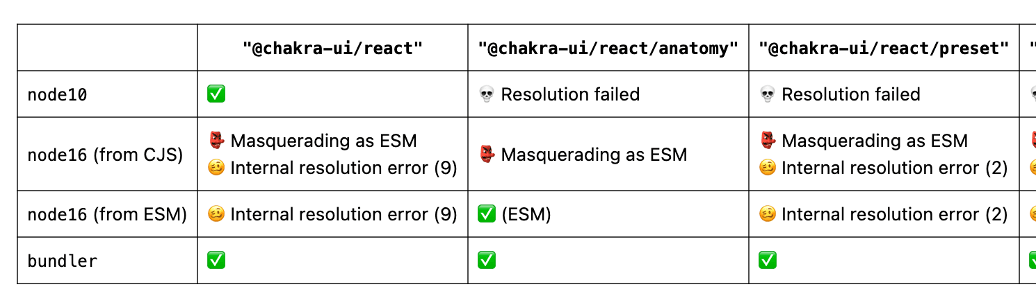 exports 필드로 정의한 sub path를 해석하지 못하는 경우였는데요. 예를 들어 import { Foo } from '@temp/foo' 같이 "패키지명/exports 필드로 정의한 경로"를 해석하지 못하는 경우였어요. Are the types wrong? 에서 확인했을 때, node10에서는 sub path 해석이 안 되는 것을 확인할 수 있었어요.